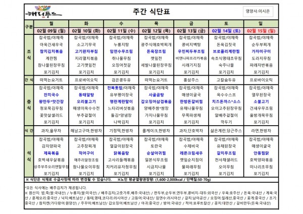 2월 둘째주 식단표 페이지 정보 작성자 은천노인복지회 작성일26-02-06 11:17 조회4,229회 댓글0건 관련링크 이전글 다음글 목록 답변 본문 2월 둘째주 어르신 식단표 안내해 드립니다. 정성과 영양을 담아 준비하겠습니다. 이전글 다음글 목록 답변