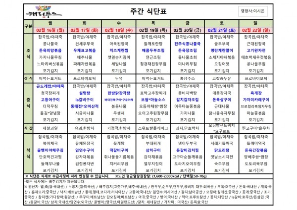 2월 셋째주 식단표 페이지 정보 작성자 은천노인복지회 작성일26-02-12 17:43 조회3,672회 댓글0건 관련링크 이전글 다음글 목록 답변 본문 2월 셋째주 어르신 식단표 안내해 드립니다. 정성과 영양을 담아 준비하겠습니다. 이전글 다음글 목록 답변