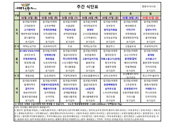 2월 넷째주 식단표 페이지 정보 작성자 은천노인복지회 작성일26-02-20 16:17 조회3,342회 댓글0건 관련링크 이전글 다음글 목록 답변 본문 2월 넷째주 어르신 식단표 안내해 드립니다. 정성과 영양을 담아 준비하겠습니다. 이전글 다음글 목록 답변