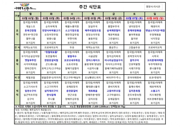 3월 첫째주 식단표 페이지 정보 작성자 은천노인복지회 작성일26-02-27 13:13 조회2,626회 댓글0건 관련링크 이전글 다음글 목록 답변 본문 2월 넷째주 어르신 식단표 안내해 드립니다. 정성과 영양을 담아 준비하겠습니다. 이전글 다음글 목록 답변
