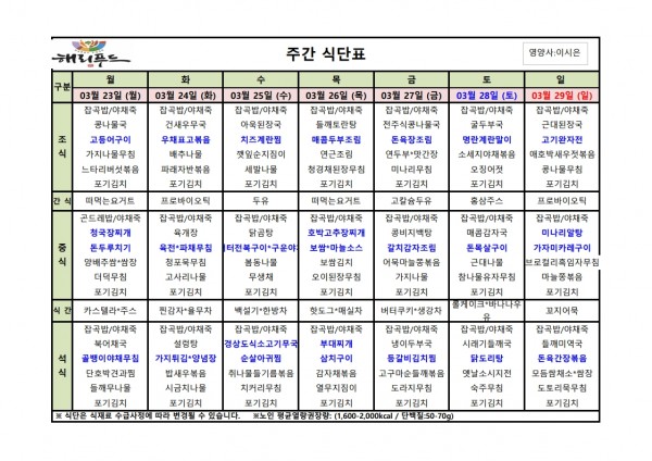 3월 넷째주 식단표 페이지 정보 작성자 은천노인복지회 작성일26-03-20 16:40 조회800회 댓글0건 관련링크 이전글 다음글 목록 답변 본문 3월 넷째주 어르신 식단표 안내해 드립니다. 정성과 영양을 담아 준비하겠습니다. 이전글 다음글 목록 답변