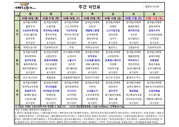 4월 첫째주 식단표 페이지 정보 작성자 은천노인복지회 작성일26-04-03 17:58 조회39회 댓글0건 관련링크 다음글 목록 답변 본문 4월 첫째주 어르신 식단표 안내해 드립니다. 정성과 영양을 담아 준비하겠습니다. 다음글 목록 답변
