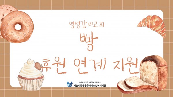 [재가노인지원서비스] 2026년 3월 영성감리교회(빵) 후원 페이지 정보 작성자 은천노인복지회 작성일26-04-06 11:18 조회18회 댓글0건 관련링크 이전글 다음글 목록 답변 본문 기관 인근에 위치한 '영성감리교회'에서 빵(단팥, 소보로, 완두앙금) 200개를 후원해주셨습니다. 이전글 다음글 목록 답변